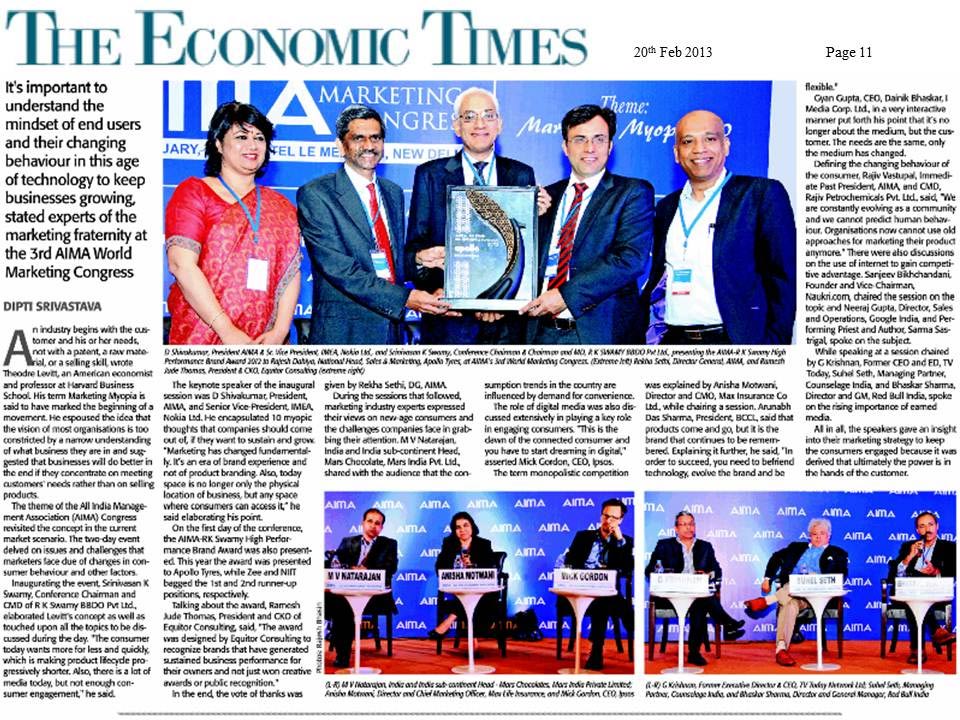 From the recently concluded edition of the World Marketing Congress at New Delhi. Equitor continues to be the Knowledge Partner for the AIMA-RK Swamy High Performance Brand of the Year award.